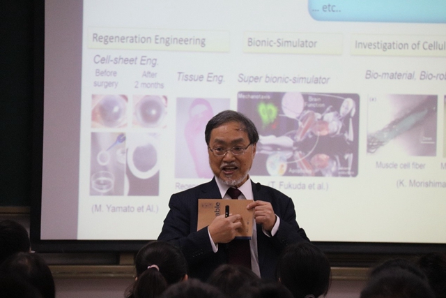 福田敏男院士的講座內容豐富,生動活潑。他圍繞機器人系統的設計與控制進行了細致講解,并結合大量視頻,為大家展示了機器人領域最前沿的科研成果。報告中還著重介紹了微納機器人的原理、關鍵技術、發展現狀以及未來在生物、醫學等領域的廣闊應用前景,多數成果都來自福田敏男院士本人的實驗室,因而他對此如數家珍,深入淺出的講解引起同學們陣陣共鳴。