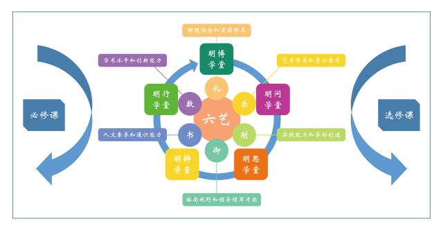 六藝取自《周禮·保氏》中的“養國子以道,乃教之六藝:一曰五禮,二曰六樂,三曰五射,四曰五御,五曰六書,六曰九數” ,是中國周朝的貴族教育體系,也是我國古代教育重視全面發展的有力實證。明德書院充分挖掘“六藝”的時代新內涵,賦予“六藝”新內容,形成了理想信念和道德修養之“禮”、藝術修養和身心素質之“樂”、實踐能力和勞動創造之“射”、格局視野和領導領軍才能之“御”、人文素養和通識能力之“書”和學術水平和創新能力之“數”。