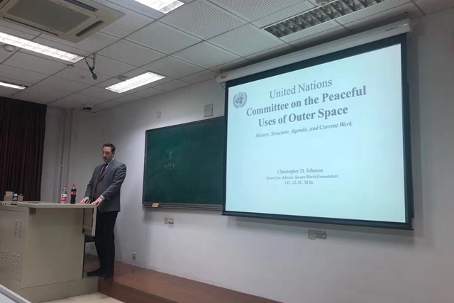 此次講座,Christopher顧問主要介紹了聯合國和平利用外層空間委員會(UNCOPUOS)的基本情況,包括和平利用外空委員會的歷史、組織結構、日常工作事項和議程以及當前的工作情況。在講座中,同學們反響熱烈,積極發言討論。通過Christopher對和平利用外空委員會以及其與聯合國其他組織的結構和聯系的講述,同學們對聯合國和空間法有了更深刻的認識。