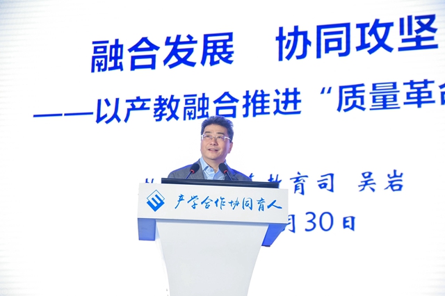 吳巖的主旨報告以“融合發展 協同攻堅——以產教融合推進‘質量革命’”為題。他強調,黨的十九屆四中全會為新時代高等教育事業發展指明了前進方向,要將推進高等教育治理體系和治理能力現代化建設的重大使命轉化為高等教育強國建設的強大動力,二者之間的實踐邏輯環環相扣,目標指向一以貫之,重大舉措接續遞進。吳巖強調,提高高等教育的管理質量和管理水平是推進高等教育治理體系和治理能力現代化建設的關鍵和重點,全面打贏“質量革命”攻堅戰,就要打好“結構優化”攻堅戰、“模式創新”攻堅戰、“學習技術”攻堅戰、“質量體系”攻堅戰。吳巖強調,產教融合是促進校企協同育人的基本手段,是實現產學研用結合的主要方法,是提高人才培養質量的重要途徑。深化產教融合,推進協同育人,必須從調結構、促升級,創機制、破壁壘等方面尋求突破,真正提高高等教育質量,助力新工科、新醫科、新農科、新文科交織交融、引領發展。