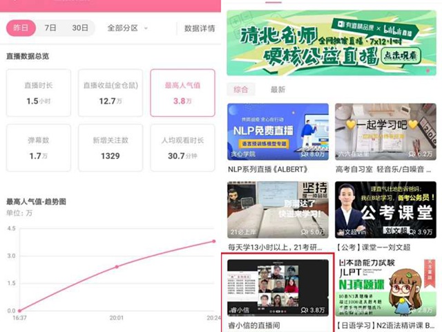 本次年級大會直播持續1.5小時,得到了同學們的積極響應和熱情參與,彈幕數量1.7萬,最高人氣值達3.8萬,直播人氣一度躍升至嗶哩嗶哩網站學習直播區前5位。直播過程中,學生頻繁發彈幕與輔導員互動,各位輔導員也通過視頻連線與同學們分享了個人假期生活,表達了對同學們的問候和新學期寄語,輔導員白正琨演唱了歌曲《武漢伢》《都會沒事的》,引發了同學們的深切共鳴,“睿小信”直播間發出了“武漢加油,中國加油”的彈幕呼聲。