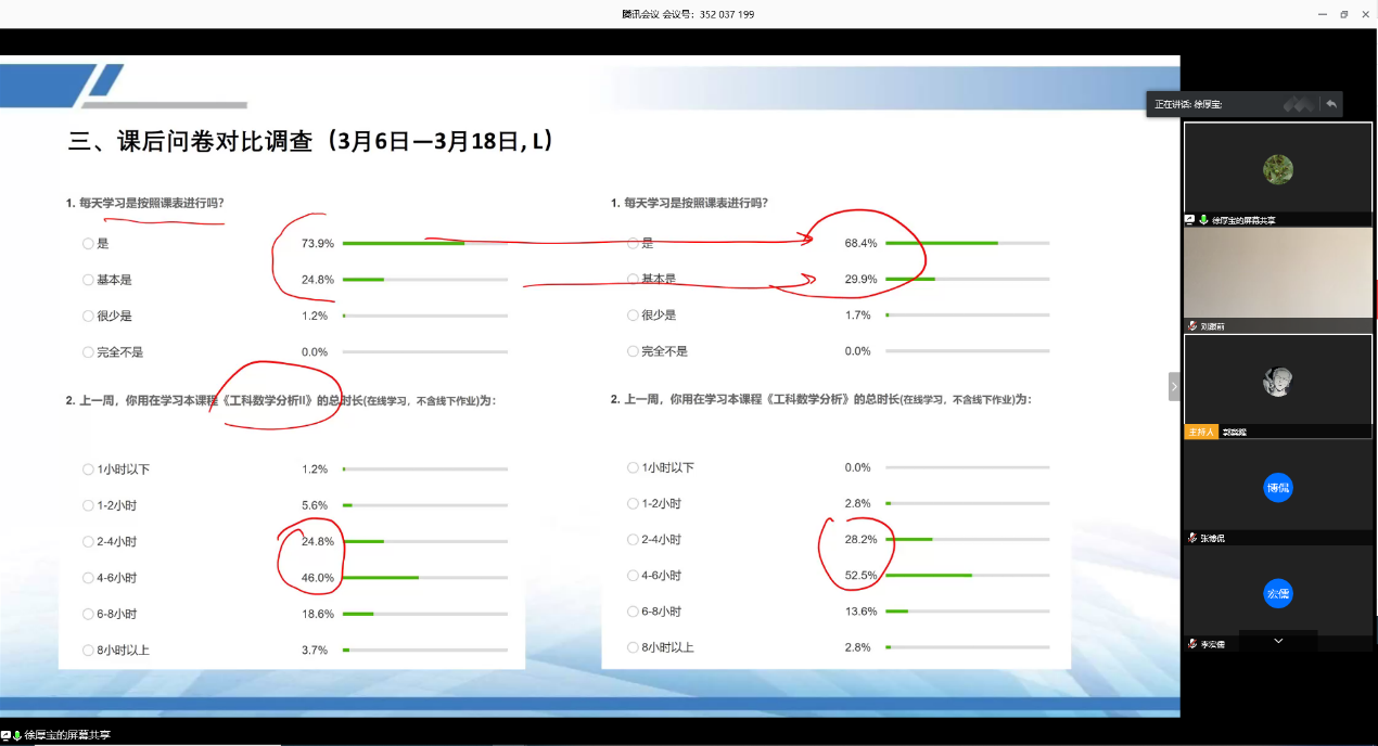 承擔線上教學的教師們就如何調動學生積極性、如何提高學習效果進行了深入探討。針對線上教學學生積極性問題,教師們靈活利用多種教學手段提高學生的興趣和主動性。面對學生提出的各種問題,教師們不辭辛苦、甘于奉獻,通過微信、郵件等多種方式方法耐心細致答疑,力求保證學生學習效果和教學質量。針對數學授課板書量大,線上教學板書使用受限的問題,教師們紛紛曬出自己的方法、工具和高招,努力克服教具不足帶來的影響。教學方法研討活動是不斷提高教學質量的重要保證,自線上教學工作啟動后,數學與統計學院各個教學團隊通過多種方式進行教學方法的探討、交流、溝通、協作,不斷提升授課質量。