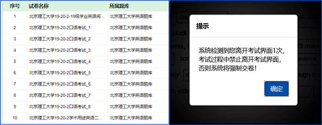 課程負(fù)責(zé)人在考試系統(tǒng)完成了2套筆試和8套口試試卷的設(shè)計(jì)和審核,并利用試卷隨機(jī)抽取、題目順序異序、答案異序等手段嚴(yán)防作弊。同時(shí),考試過程中,對切出考試作弊的學(xué)生進(jìn)行警告和強(qiáng)制交卷處理,禁止學(xué)生在系統(tǒng)上復(fù)制粘貼、禁止學(xué)生跳出考試頁面查詢答案,利用防切屏功能,保證學(xué)生在考試過程獨(dú)自完成作答。