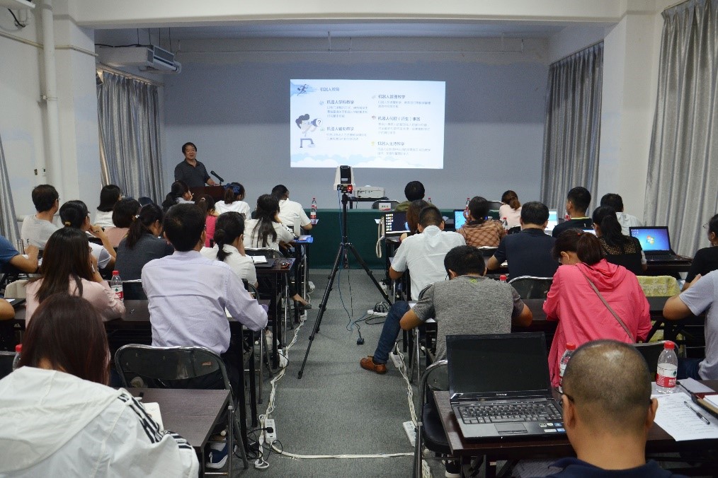 羅慶生教授率陳禹含、林彬彬、許仕杰、劉楊四名北京理工大學博士、碩士研究生擔任本次培訓的主講教師及主訓導員,為運城地區中小學科技老師帶來了豐富多彩的機器人相關課程及實踐活動。在為期兩天的培訓時間里,大家科學施教、分秒必爭,為參訓學員講解了機器人的基本構成、基本的編程思想以及觸碰傳感器、電位計傳感器、紅外傳感器、光電傳感器、光敏傳感器的基本原理和使用方法;此外,還特地為參訓學員們設計了簡單易懂的編程案例,這些案例可擴展、可移植,其中具有代表性的有光敏路燈、遙控小車、輪速測量、循跡小車以及用觸碰傳感器實現摩斯電碼編制。這些實例使當地科技教師深刻理解了相關傳感器的原理與作用,并體會到使用簡單傳感器也能實現復雜功能。通過兩天的培訓學習,參訓學員對青少年機器人教育產生了濃厚的興趣,積極提問并探索改進,取得了滿意的效果。
