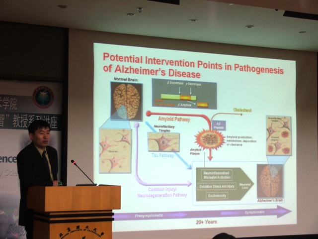 在講座中,李新民教授介紹了目前在抗老年癡呆這個領域上的總體情況及其目前的研究動態。他指出抗老年癡呆是一個對人類健康與發展具有重要的一個方面,在講座中他重點講述了老年癡呆癥的病理、其在各國的發病情況、目前的治療手段以及今后的治療藥物的研發方向和策略。現階段隨著醫療手段的發展和進步,對治療人類的各種病癥都起到了積極的作用,但是老年癡呆癥人們還沒有完成的攻克,李教授分析了這其中的各個環節,并提出了自己獨到的見解和一些戰略問題。
