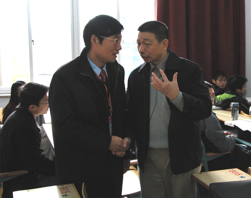 專家組成員、浙江理工大學校長、教授、博士生導師裘松良聽完課后,來到外國語學院進行走訪,聽取學院匯報后,他就我校的延安精神、國防特色、實踐教學三個方面與教師進行了交流,并對國際交流、教師進修等問題提出了建設性建議。他還走訪了教務處、實驗室設備處,參加了教學管理干部座談會。