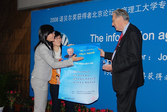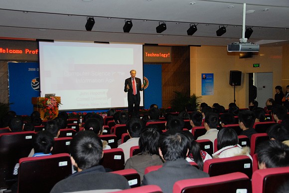 同時,剛剛被聘為我校名譽教授的圖靈獎獲得者(1986年)約翰·E·霍普克洛夫特在我校圖書館報告廳作了精彩的報告。約翰·E·霍普克洛夫特的報告題為《信息時代的計算機科學(Computer Science in the Information Age)》。約翰教授認為,我們生活的各個方面都正在著發生深刻的變革,而體會到這個變革并做好準備的人將會獲得巨大的收益。