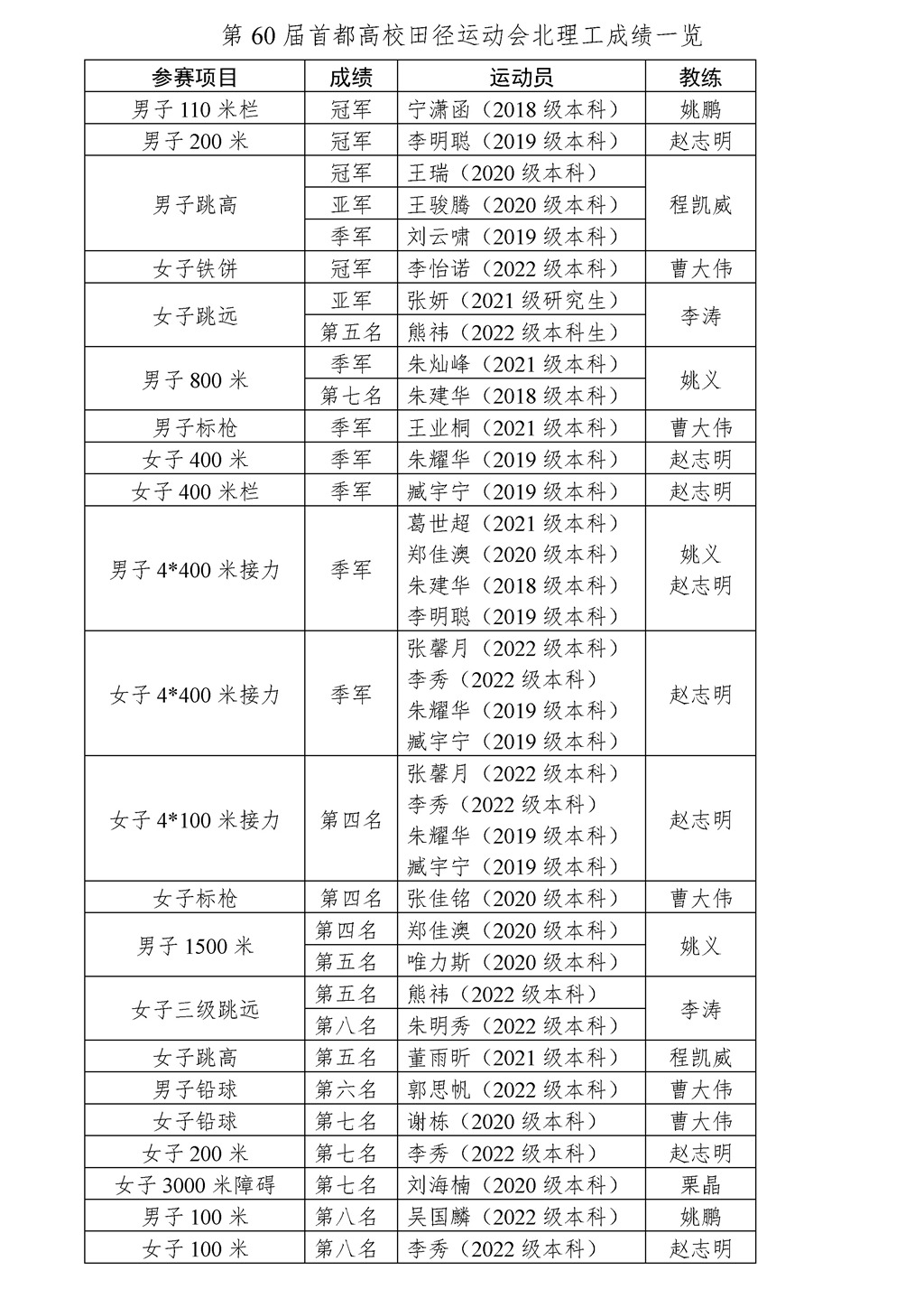 北理工在首都高等學校第60屆學生田徑運動會取得優異成績