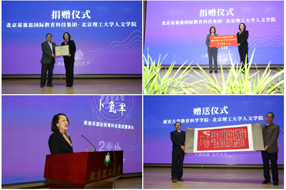 典禮上,卜氫軍女士代表北京易賽思國(guó)際教育科技集團(tuán)為學(xué)院捐贈(zèng)150萬(wàn)元,支持學(xué)院辦學(xué)。楊賓代表學(xué)校向卜氫軍女士頒發(fā)捐贈(zèng)證書。卜氫軍女士在發(fā)言中表達(dá)了支持國(guó)家教育事業(yè)的熱忱,表達(dá)了對(duì)學(xué)校和學(xué)院的誠(chéng)摯祝福。