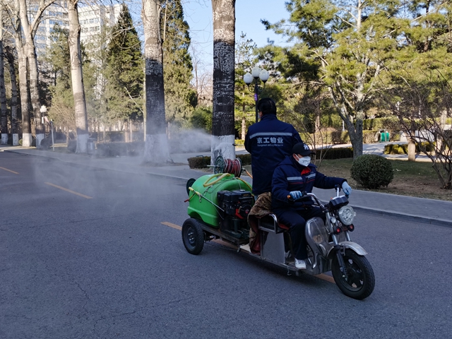 從2019年除夕至今,物業服務中心在京員工一直堅守崗位、無怨無悔、保衛校園,物業中心每日3次對學生公寓樓、教學辦公樓樓和家屬樓內公共區域進行消毒和開窗通風,人員密集的8號教師公寓樓內公共空間每日消毒4次;每日至少1次對校園干道、垃圾站點、家屬區外圍等室外公共區域進行消毒;運行班車每日2次消毒,每班次通風,確保消殺防疫無死角。