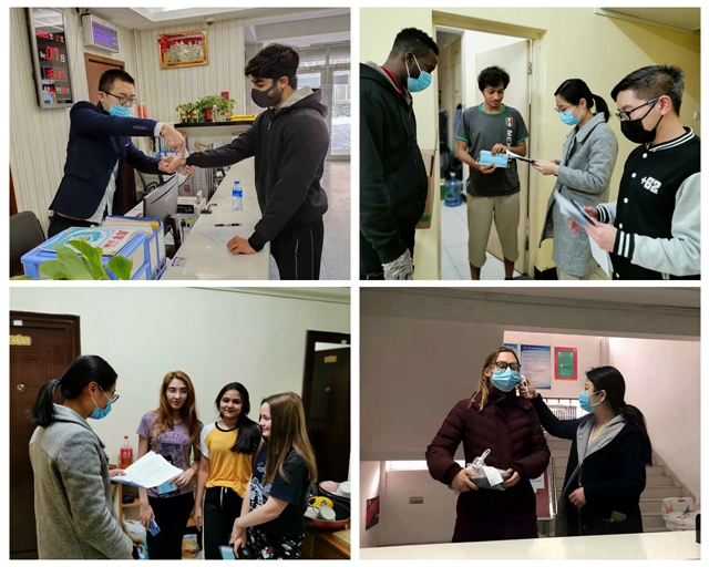 春節(jié),本是家人團聚的日子。而疫情發(fā)生后,很多訂好車票準(zhǔn)備回家過年的公寓管理人員毅然退票,主動提出放棄休假,決心繼續(xù)堅守崗位。公寓經(jīng)理滕飛一天驅(qū)車1400公里迅速返崗,第一時間落實防控任務(wù)、合理排班上崗、籌措抗疫物資,做好各項后勤保障。“心里牽掛著這些外國孩子,我們知道疫情很嚴(yán)峻,所以這個時候我們絕不能休息。在與大家一起奮戰(zhàn)的日子里,度過了我人生中最難忘的生日。”公寓副經(jīng)理肖忠建誠摯的話語代表了全體公寓管理人員的心聲和決心。全體管理人員承諾要堅守崗位、絕不掉隊,全身心投入到疫情防控工作中。