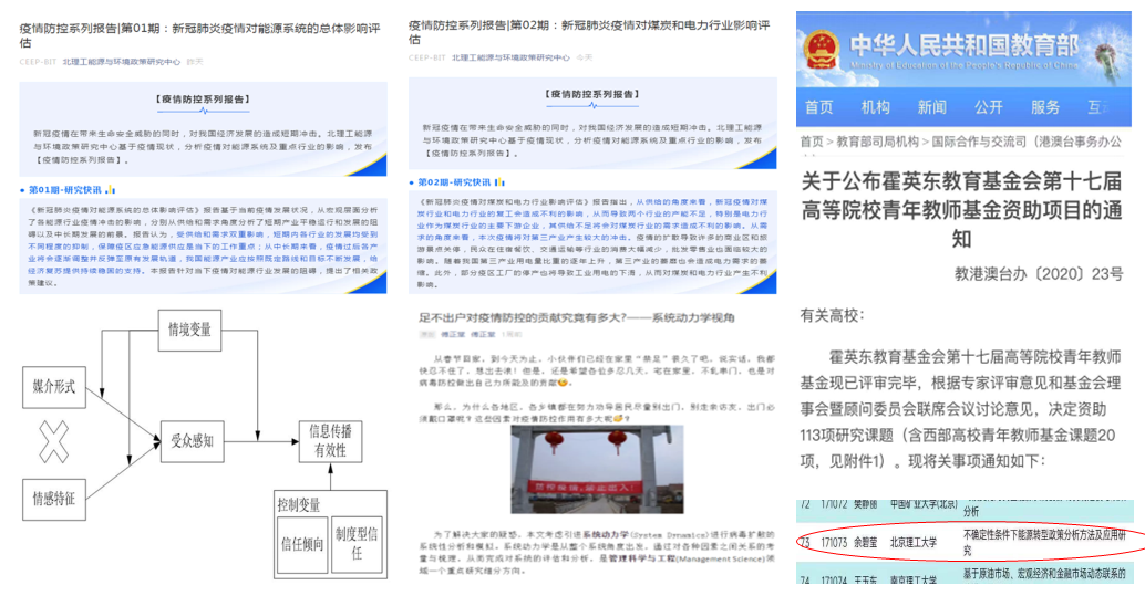 科研方面,疫情防控期間,正值基金項目申報的關鍵時間,學院通過點對點線上咨詢基金申報教師,完成包括外籍教師、外籍博后在內的在職教師、博后、新入職教師基金申報進度統計工作。研究生在導師遠程指導下認真開展科研工作,取得多項科研成果。疫情防控期間師生發表多篇論文,余碧瑩教授榮獲第17屆霍英東青年教師基金。學院能源與政策研究中心郝宇、呂鑫老師在魏一鳴教授和廖華教授指導下完成并對外發布了《新冠肺炎疫情對能源系統總體影響評估》、《新冠肺炎疫情對油氣行業的影響》《新冠肺炎疫情對可再生能源行業影響評估》和《新冠肺炎疫情對煤炭和電力行業的影響與評估》四篇系列報告。學院劉平青教授應邀在人力資源教授薈發表《惟有理性反思,方能持續開工》文章,從專家學者視角為企業“戰疫”貢獻智慧。學院智慧健康研究中心賈琳等老師指導學生針對新型肺炎疫情初期謠言頻傳及科普視頻內容質量參差不齊的現狀,從科普內容形式及健康信息披露方式視角出發,結合媒體豐富度模型,研究疫情背景下信息傳播有效性的影響因素,以期為相關部門在公共健康安全事件爆發期間如何有效地組織信息的披露以及健康、預防、治療信息的科普宣傳提供政策建議。學院博士生傅正堂運用系統動力學(system dynamics)方法,采用仿真建模手段,從管理學角度分析了當前的防疫措施(戴口罩,勤洗手,少出門,不聚會等)對阻止病毒傳播的重大作用,借助新媒體手段制作推送“足不出戶對疫情防控的貢獻究竟有多大——系統動力學視角”,向社會大眾科普居家隔離對疫情防控的重要性。