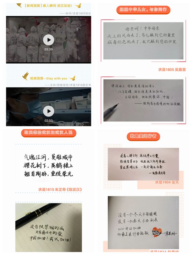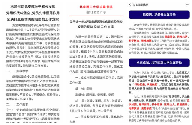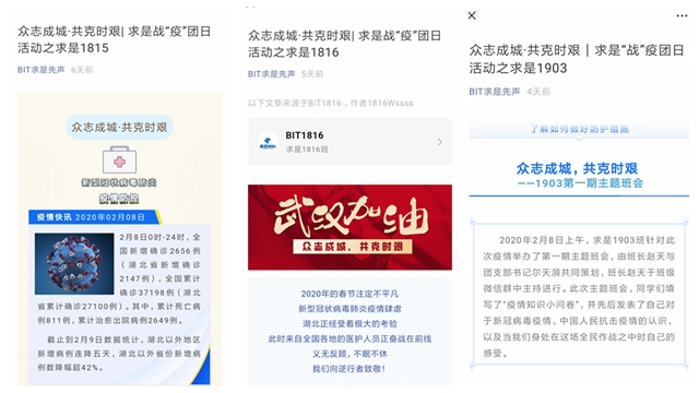 “祖國受難之時,我們更應該理智地保護她,做這個時代冷靜的‘發聲者’。”“疫情過后,中國青年更具情懷與擔當?!薄霸谇斑M的路上,我們一定還會遇到新的困難,我們也一定有必勝的決心!”自書院七大戰“疫”行動實施以來,青年學生反響熱烈,優秀網絡作品征集投稿踴躍,書院也積極通過官方公眾號“BIT求是先聲”發布,用正能量鼓勵廣大求是學子堅定信心,共克時艱。