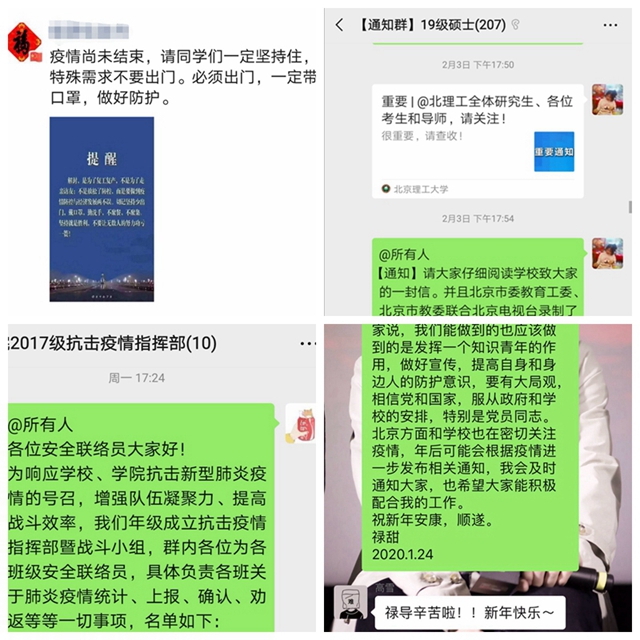 在學院黨委領導下,學生工作組迅速恢復工作狀態,通過微信公眾號、微信群等多種方式向學生傳達學校、學院的各項防控工作要求,普及官方防疫科學知識,確保學生知曉最新規定。