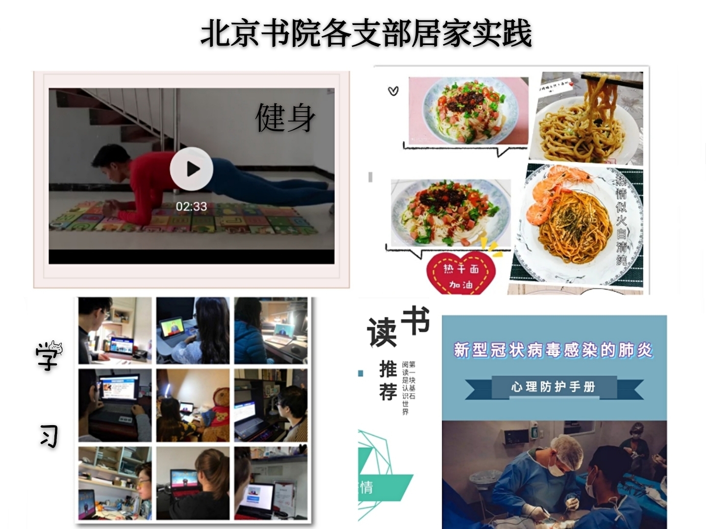 創(chuàng)新宣傳形式傳播正能量。書院充分調(diào)動師生力量,尤其是黨員和學(xué)生干部力量,依托新媒體平臺做好網(wǎng)絡(luò)輿情宣傳工作。進(jìn)一步推進(jìn)微信公眾號平臺建設(shè),現(xiàn)已通過BITBJNEWS推出科學(xué)防疫知識、征文、健身、心理、美食、讀書、開學(xué)等系列新聞作品19個。積極宣傳防疫科學(xué)知識,全面動員學(xué)生參與網(wǎng)絡(luò)線上“眾志成城 共克時艱”主題征文活動,傳遞戰(zhàn)勝疫情的堅定信心,共發(fā)布180個提醒和通知,涉及學(xué)生上網(wǎng)課、心理、生活、健康等各類問題。線上活動也成為開展學(xué)生活動的一種新載體,新形式,各群團(tuán)組織發(fā)揮部門特色,聚焦學(xué)生學(xué)習(xí)生活,以文化藝術(shù)作品的形式為抗“疫”助力發(fā)聲。