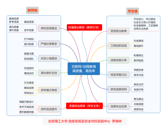 北京市教學名師、國家級特色專業(信息對抗技術)的“掌門人”羅森林教授有著豐富的教學經驗,構建了一套“三站兩線一群”的教學范式,整合優勢,打出一套在線教學的“組合拳”。羅森林在本學期主講“信息系統安全與對抗技術”研究型課程,該課程面向2017級本科生,有31名學生。在教學中,他運用學校“樂學”平臺為提供豐富的教學資源,使用自己在“中國大學MOOC”開設的慕課開展教學,同時在工信部信息系統及安全對抗實驗中心網站發布了“課程教學能力促進系統”,為學生提供實踐操作的線上平臺;“在線+離線”的學習任務發布;建設課程微信群,在發布學習要求通知的同時,為學生提供實時動態交流,滿足每一名學生個性化的學習需要。羅森林把自己這套教學方式概括為“互聯網+遠程教育”系統解決方案,在實際教學中確保了在線教學高質高效。