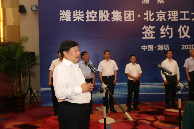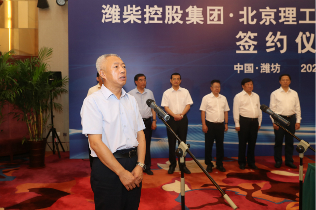 張軍代表北理工對山東省委省政府、濰坊市委市政府、濰柴集團長期以來的支持表示感謝。他談到,北京理工大學為中國共產黨創辦的第一所理工科大學,八十年來一直傳承著紅色基因,致力于為國家重大戰略和前沿科技領域提供智力支撐、培養優秀人才。濰柴集團是濰坊市和山東省的領軍企業,是我國裝備制造業的典范。他希望雙方在人才培養和科技創新等方面深入合作,打造校企合作的典范,共同助力我國制造強國建設。