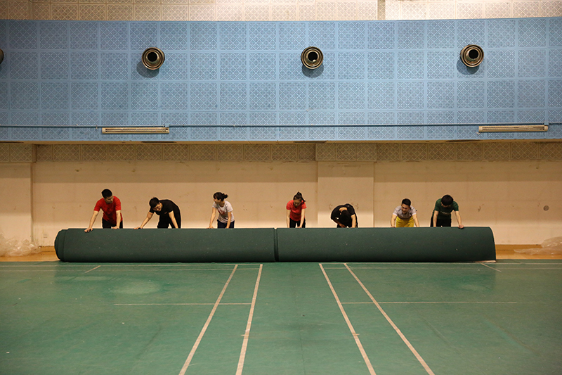 武術(shù)隊(duì)每天的訓(xùn)練都從鋪地毯開始,重以噸計(jì)的地毯需要大家一起用力才能完全鋪開。鋪好地毯,大家就開始自發(fā)地進(jìn)行熱身準(zhǔn)備活動(dòng)。“這些孩子都是從小就學(xué)武術(shù),每天都要練基本功。”張老師在關(guān)注同學(xué)們做動(dòng)作的同時(shí)也會(huì)時(shí)不時(shí)地進(jìn)行動(dòng)作指導(dǎo),“腿快一點(diǎn)”、“重心放低”、“這個(gè)動(dòng)作要定住” ……隊(duì)員們也都認(rèn)真地進(jìn)行著動(dòng)作的改進(jìn)。