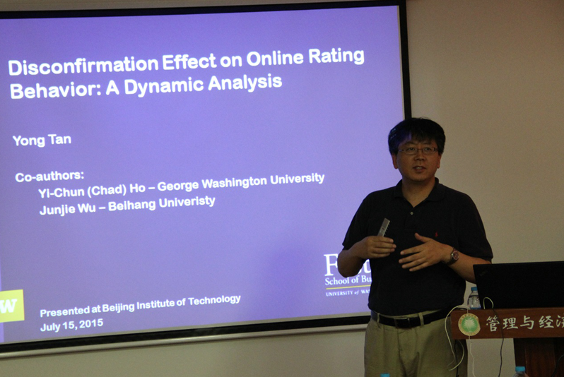 7月15日,第六場學術講座在我校管理與經濟學院舉行。講座由管理與經濟學院協辦,邀請了美國華盛頓大學福斯特商學院譚勇教授,為師生們作了題為“Disconfirmation Effect on Online Rating Behavior: A Dynamic Analysis”的學術報告,受到了老師和同學們的熱烈歡迎。譚勇教授圍繞網上商品評價這一熱點問題展開,講解了商品不確定性對消費者評價行為的影響等內容。譚勇教授的報告深入淺出,在座師生收獲良多,并與譚教授就感興趣的問題進行了熱烈的討論。