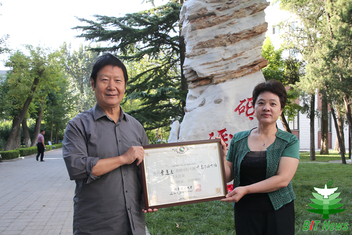 秉承京工精神砥礪前行,畢業五十載情系母校。2015年9月19日,在北京理工大學建校七十五周年校慶之際,光電學院41642班“砥礪”文化石、書畫捐贈儀式在七號教學樓前舉行。北京理工大學黨委副書記、副校長項昌樂,原黨委書記焦文俊,宣傳部部長包麗穎,校友會辦公室主任段麗萍,后勤集團常務副總經理宋希博,光電學院院長薛唯,規劃處副處長周連景,教育基金會辦公室主任羅雪和41642班部分校友參加了捐贈儀式。儀式由光電學院院長薛唯主持。